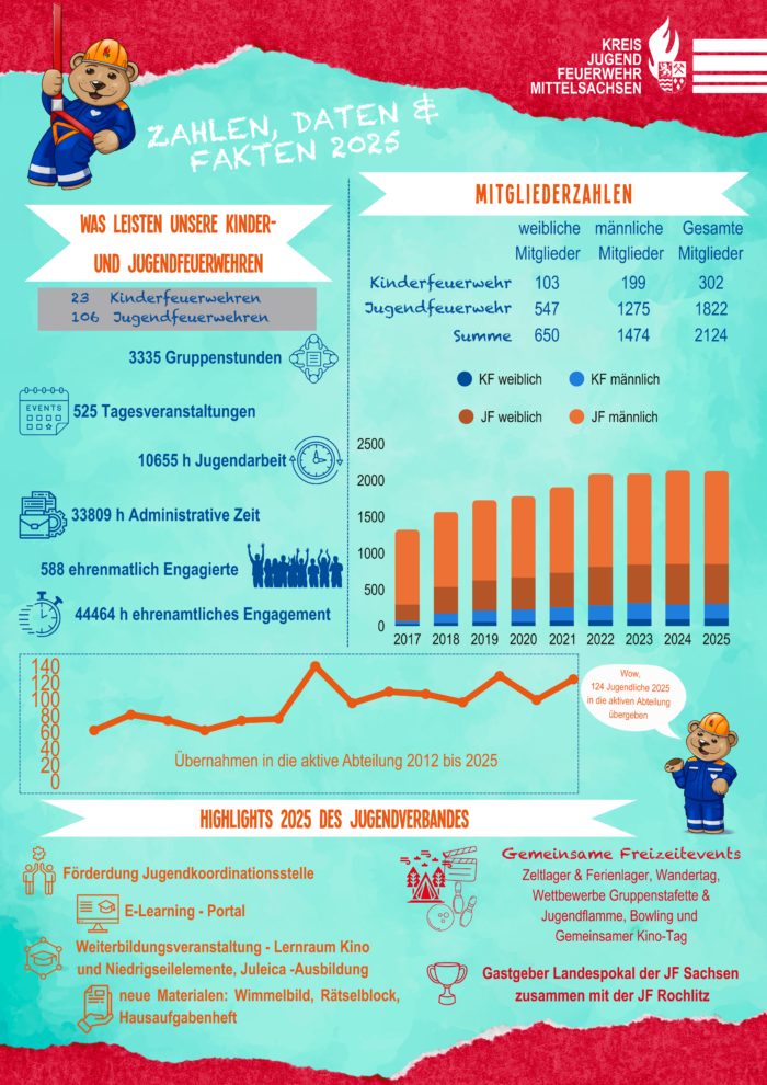 Die Erhebung der Jahresberichte 2025 der Kreisjugendfeuerwehr Mittelsachsen zeigt, dass die Kinder- und Jugendfeuerwehren im Landkreis weiterhin stabil und leistungsfähig aufgestellt sind. Insgesamt engagieren sich aktuell 2.124 Kinder und Jugendliche in den Kinder- und Jugendfeuerwehren. Im Vergleich zum Vorjahr mit 2.132 Mitgliedern entspricht dies einem Rückgang von lediglich acht Mitgliedern (0,4 Prozent). Diese minimale Veränderung… → Weiterlesen